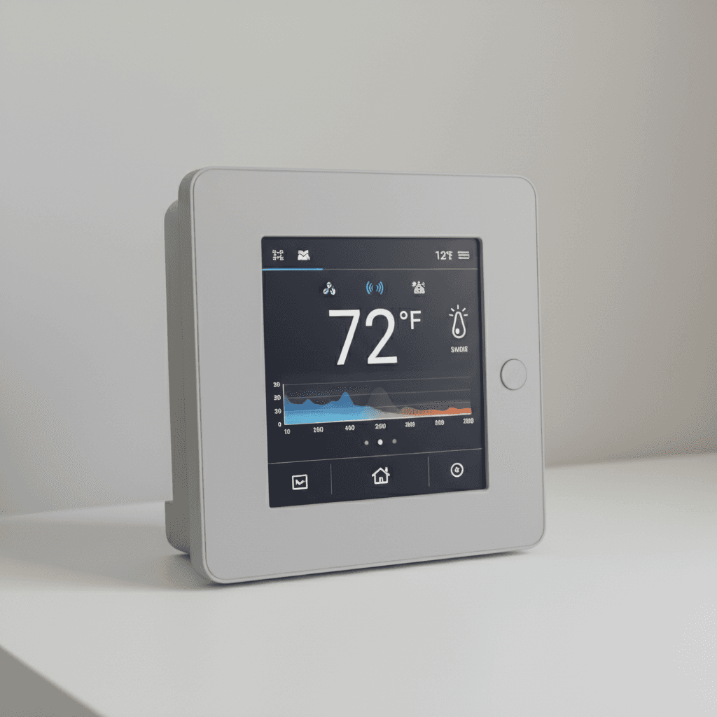 A connected thermostat that learns building occupancy patterns and automatically adjusts temperature for energy efficiency.