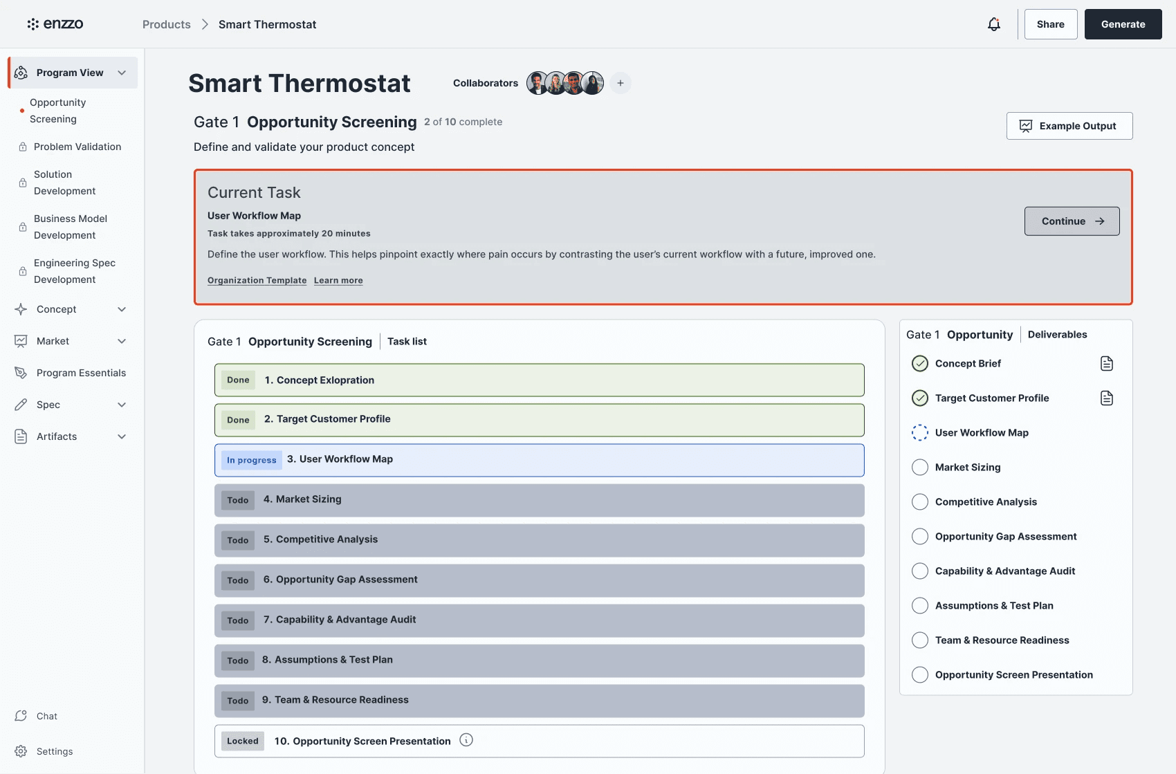 Guide your team step-by-step through every gate, auto-assemble deliverables from completed work, and keep everyone working on the same product simultaneously.