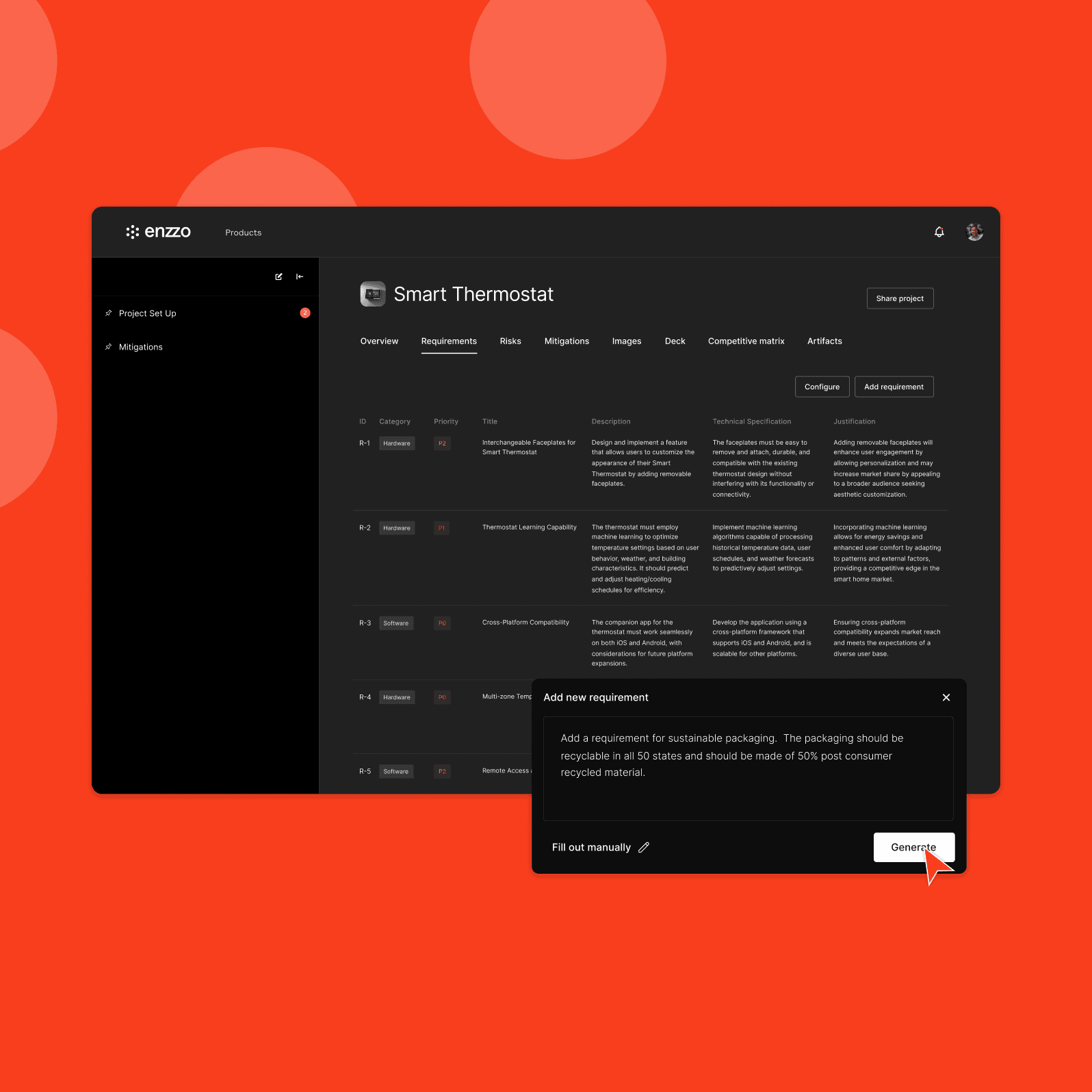 Experience unparalleled compression in your hardware development timelines. From auto-generated requirements, to intelligent risk mitigations, Enzzo supercharges your hardware development teams .