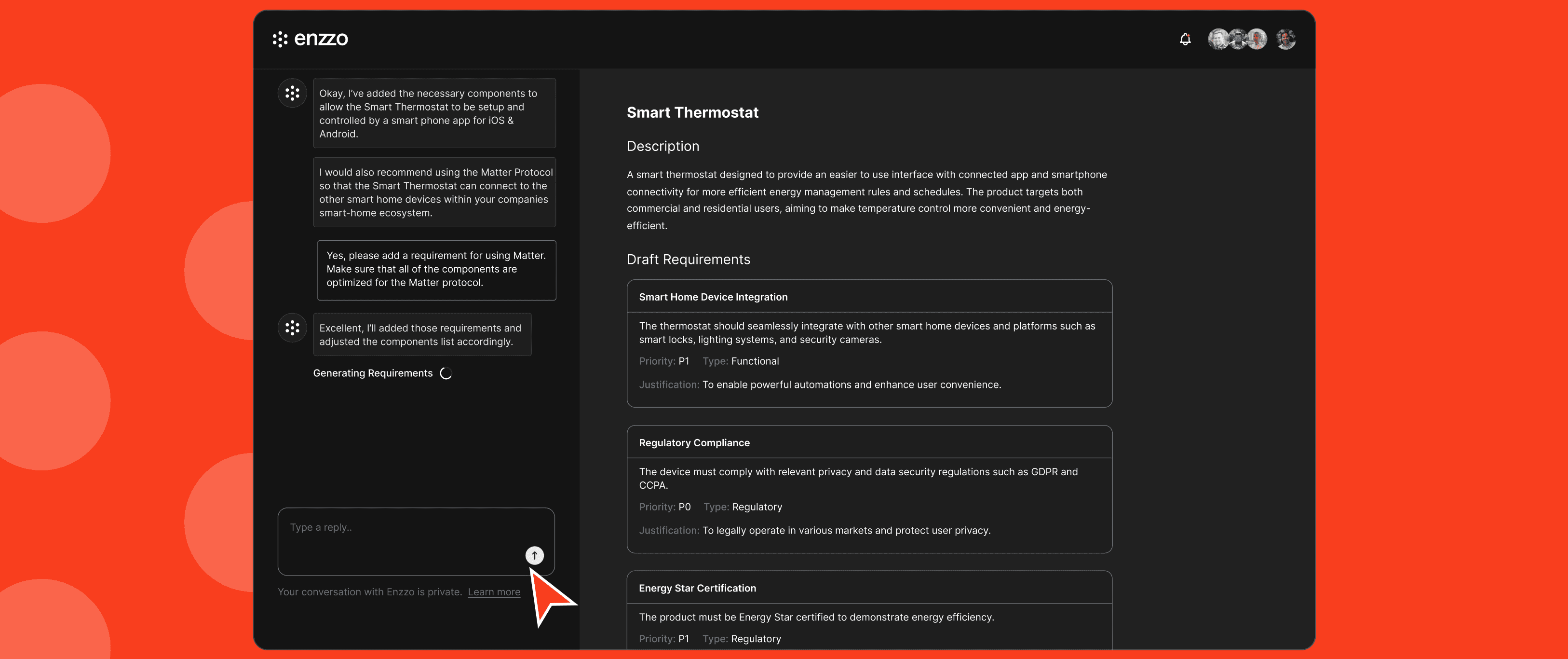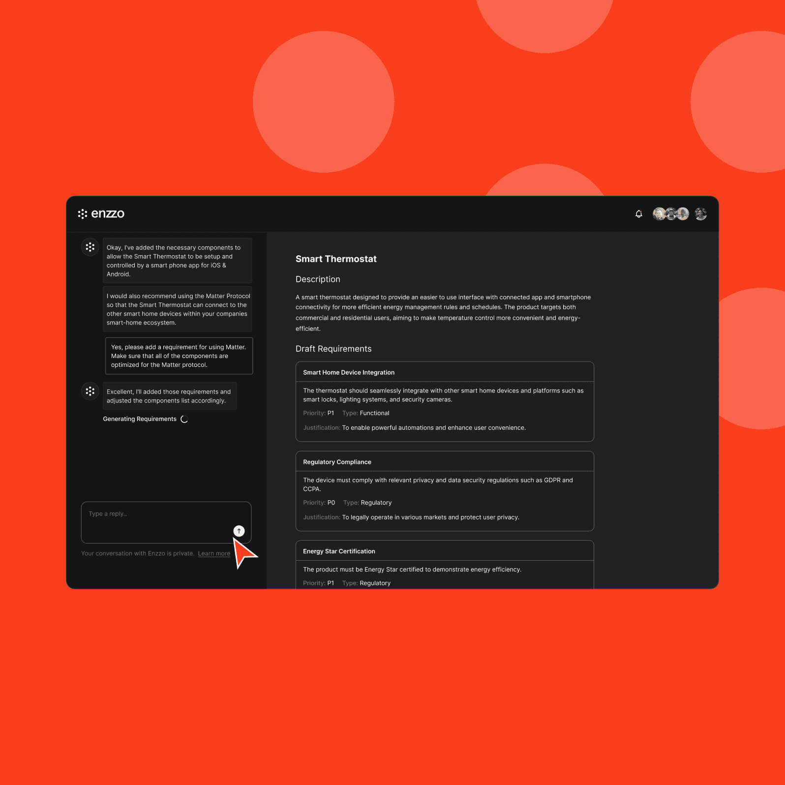 Save hours of research and development time by asking Enzzo to perform your most difficult tasks. Enzzos proprietaty AI systems find and organize the latest technologies, regulations, and standards related to your product.
