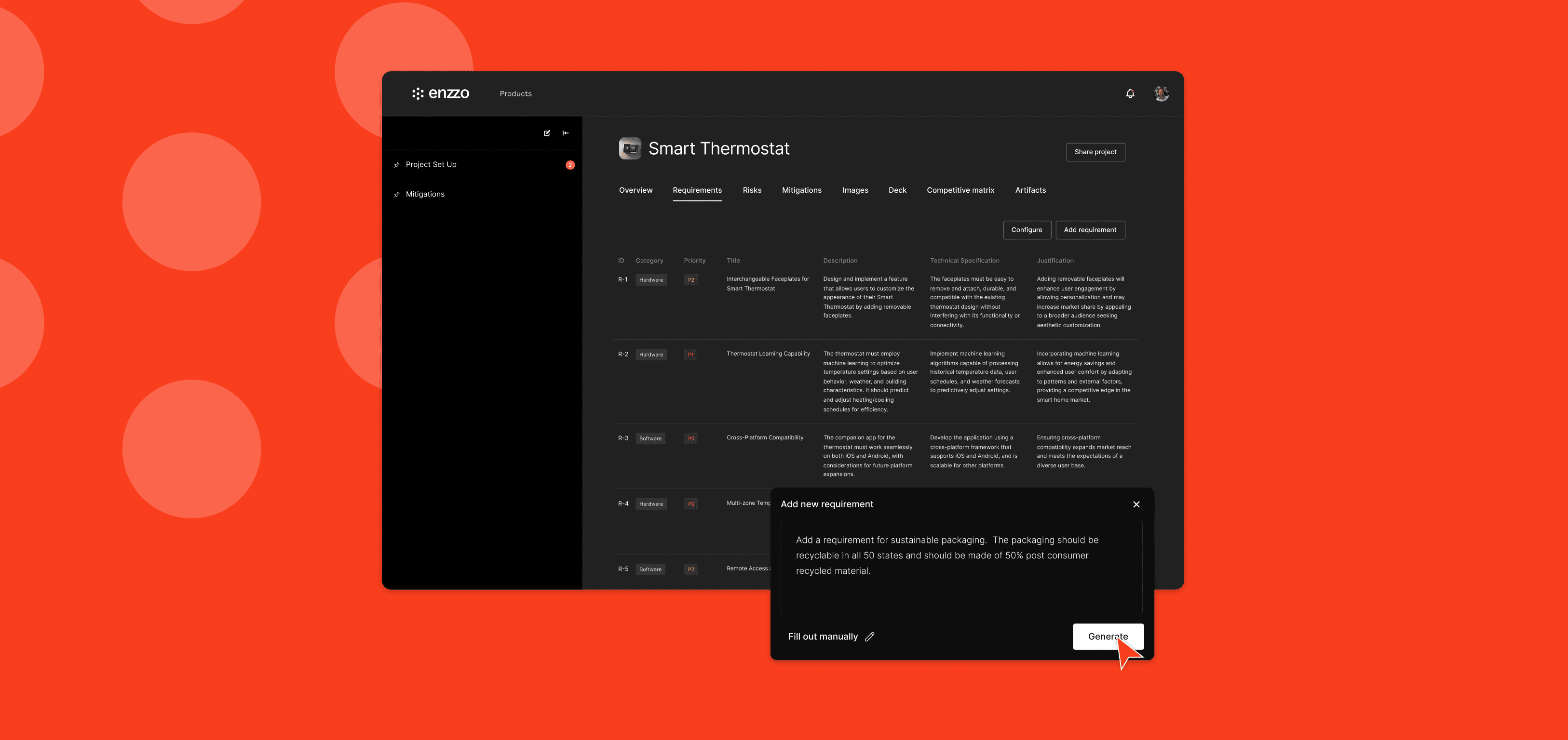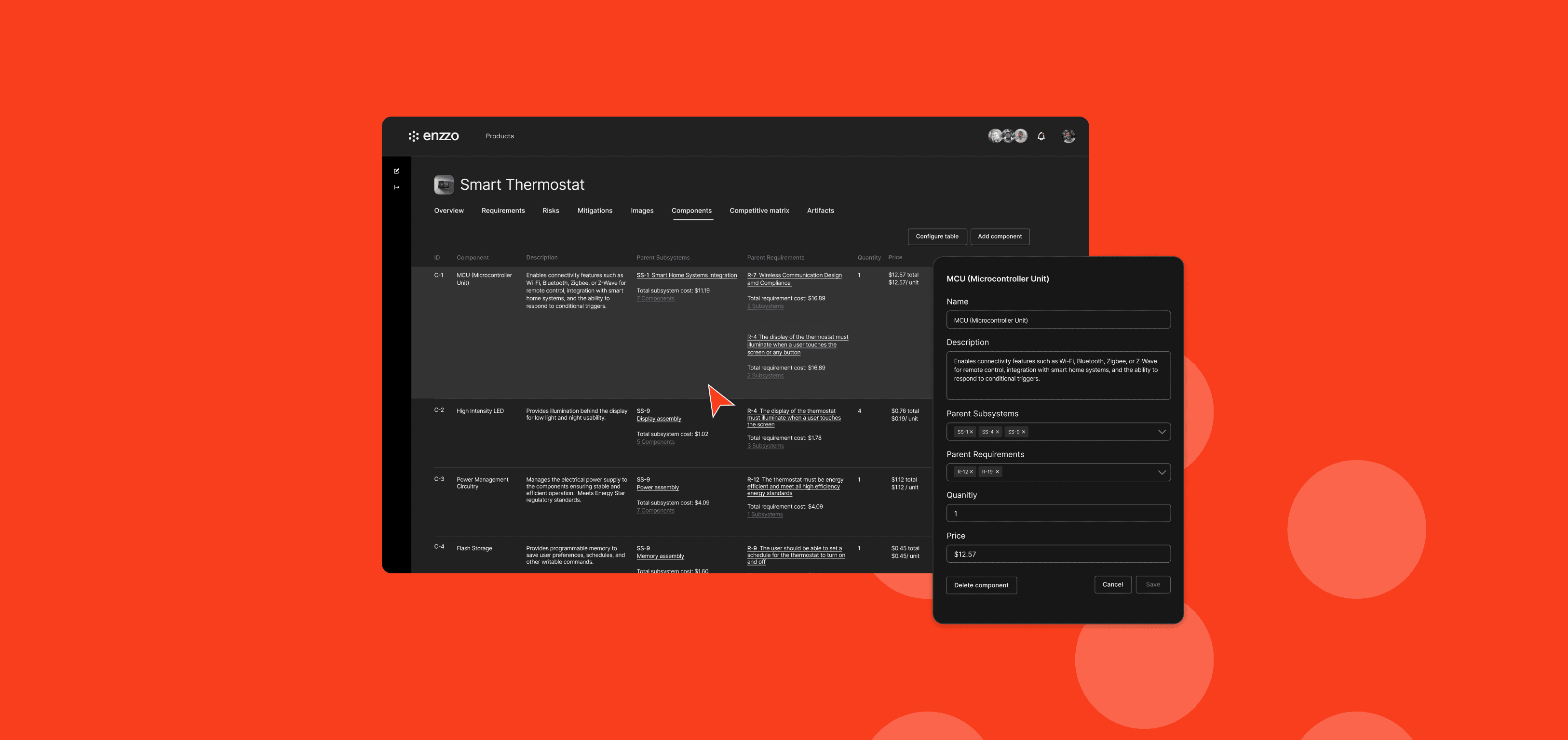 After describing your product to Enzzo, a comprehensive list of product requirements is generated and organized based on category and priority. Easily add new requirements by chatting with Enzzo, or create them manually. Requirements are linked to the components and subsystems in the component section, providing insights into how each requirements affects the overall product cost.