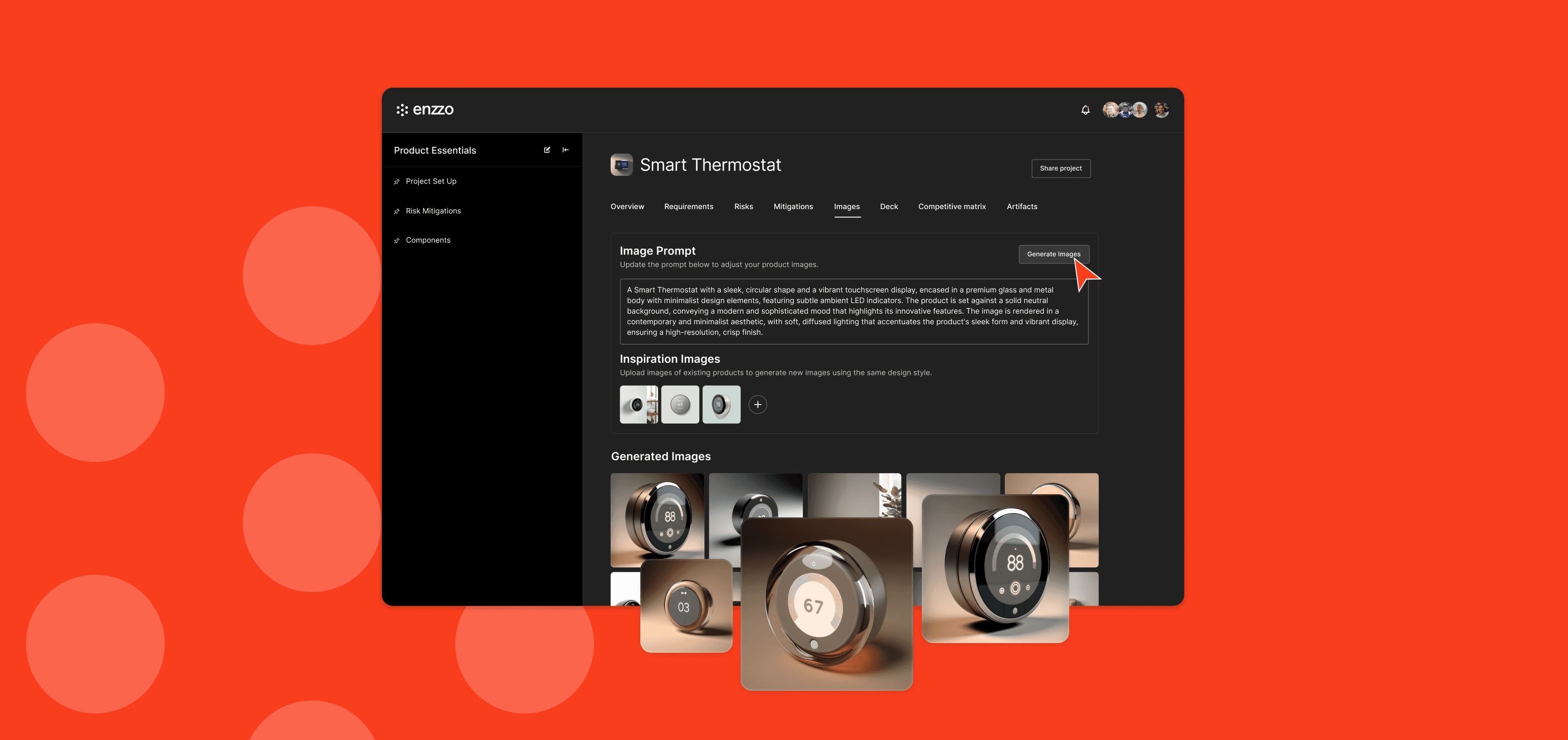 Instantly generate renderings of your product using prompts automatically created from your requirements and components. Make edits directly to the prompt or upload inspiration images of existing products to refine the design style and materials.