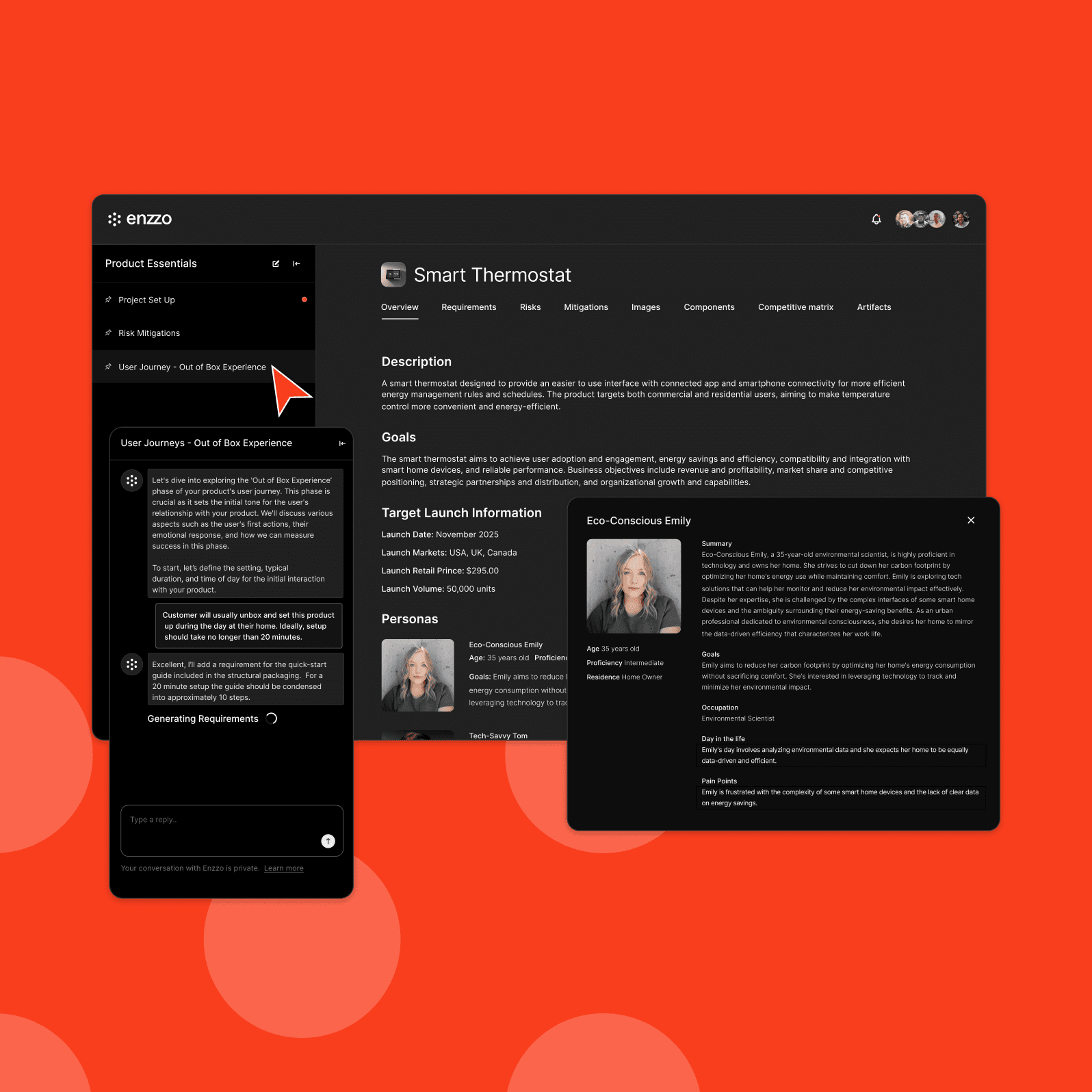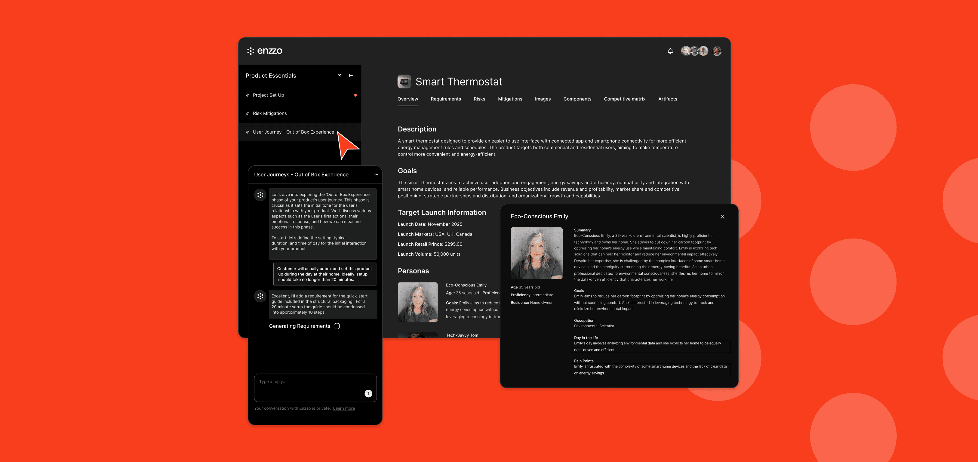 After chatting with Enzzo about your product, a comprehensive workspace is generated and organized into product areas like Requirements, Components, and Risks. The overview section outlines the product goals, target customers, and key launch information. Based on the product information, Enzzo creates detailed personas describing the customer segments your product will appeal to.
